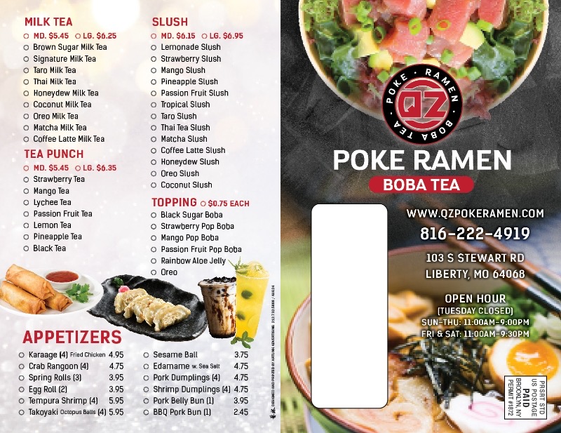 Welcome to QZ Poke Ramen & Boba Tea - Liberty, a delightful culinary gem located in Liberty, MO. This vibrant eatery offers a tantalizing menu that artfully combines the flavors of poke, ramen, and boba tea, ensuring a unique dining experience. Guests rave about the generous portions and vibrant flavors of both the poke bowls and ramen dishes. The Tonkotsu Ramen and customizable poke bowls have become crowd favorites, promising satisfaction with every bite.